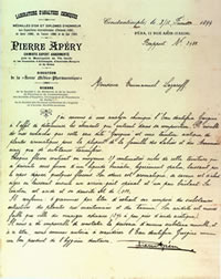 | Ekteki belge kitabın 25. sayfasından alınmış olup, Emmanuel Lazaroff adlı kişinin hazırladığı "Eau Dentifrice Georgine" (Georgine Diş Suyu) adlı müstahzarın P.Apery tarafından yapılan analiz sonuçlarını içeren raporudur. P. Apéry'nin Taksim'deki laboratuvarının başlıklı kağıdına yazılmış olan bu raporun sonunda, ürünün diş sağlığı açısından bir sakıncası olmadığı belirtilmiştir. |